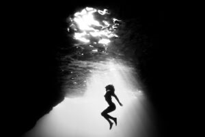 Fotoğraflarındaki siyah beyaz tercih, estetik bir kaygının ötesinde, yüzeyde görünenin ardına geçmeye dair bilinçli bir niyet taşıyor. Okyanusta ışık yalnızca belli bir derinliğe kadar ulaşır; derinlere indikçe renkler karanlığa karışır. Aynı şekilde, insanın içinde de çoğu zaman görünmeyen, saklı kalan karanlık derinlikler vardır. Okyanus gerçek renklerini ışıkla ortaya çıkarır; tıpkı insanın da kendi özünü görebilmesi için içsel bir aydınlığa ihtiyaç duyması gibi.